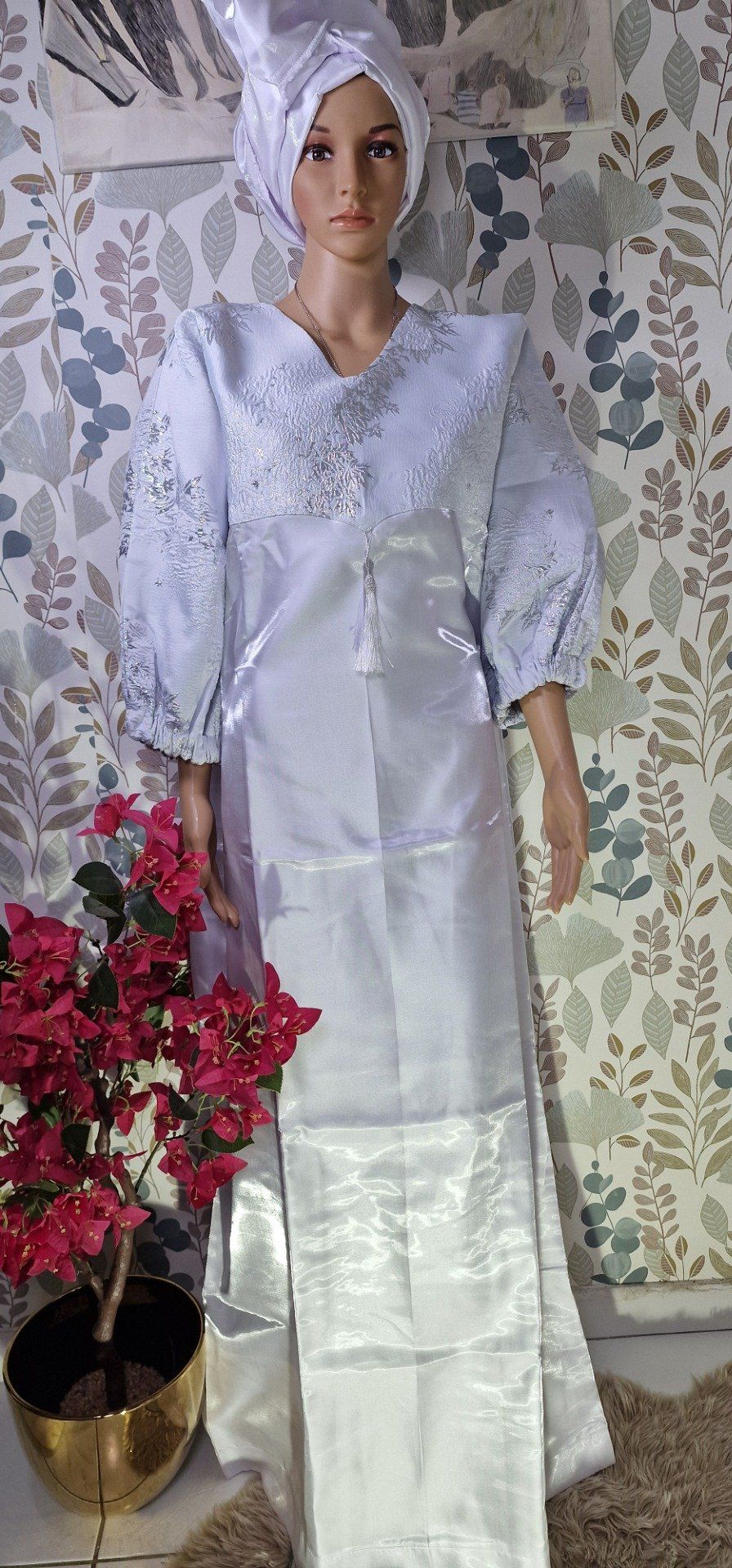 Le matière est liquide mikado en couleur blanche .Une robe cérémonie .La longueur est 57 &62